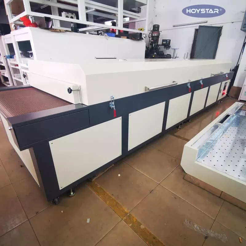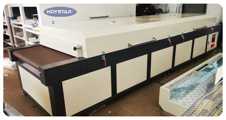 Ως επαγγελματίας κατασκευαστής στην Κίνα, θα θέλαμε να σας παρέχουμε τη μεγάλη μηχανή στεγνωτηρίου υπερύθρων HOYSTAR υψηλής απόδοσης με ιμάντα μεταφοράς. Κατάλληλο για ξήρανση διαφόρων προϊόντων —όπως υφάσματα, σημαίες, πανό, φύλλα αλουμινίου, γυαλί, χαρτί και πλαστικό—μετά από διαδικασίες όπως μεταξοτυπία, βαφή, εφαρμογή κόλλας θερμής πήξης, εκτύπωση inkjet και άλλα.